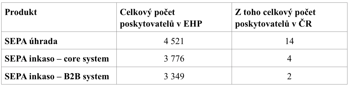 V tabulce č. 1 je uveden počet subjektů, které nabízejí SEPA úhradu a SEPA inkaso v jeho dvou základních formách, a to za celou EHP, z toho pak počet subjektů, které dotyčné produkty nabízejí v současné době v ČR. Po účinnosti výše uvedených termínů musí všichni ostatní poskytovatelé platebních služeb (až na výjimky v případě, že poskytují omezené služby), dodržet jak dosažitelnost, tak interoperabilitu. Tím pádem se počty subjektů změní pravděpodobně směrem nahoru, neboť produkty SEPA budou pro všechny poskytovatele povinné minimálně v rovině dosažitelnosti.