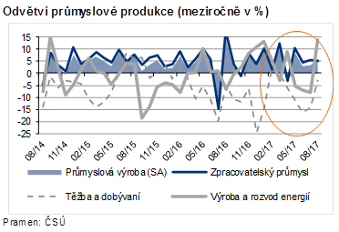 Příznivý růst srpnového průmyslu jde na vrub odvětví „výroba a rozvod elektřiny, plynu a tepla“ a tradičně také na vrub růstu výroby motorových vozidel. Nové zakázky vzrostly v srpnu o necelých 5 %. To je sice hodnota jen mírně pod celoročním průměrem 6,7 %, mírně překvapující však může být pokles nových zakázek u výroby motorových vozidel.Celkově nové zakázky v tomto doposud nejsilnějším segmentu rostou v letošním roce pouze mírně, zatímco v minulých třech letech byl jejich růst dvojciferný.