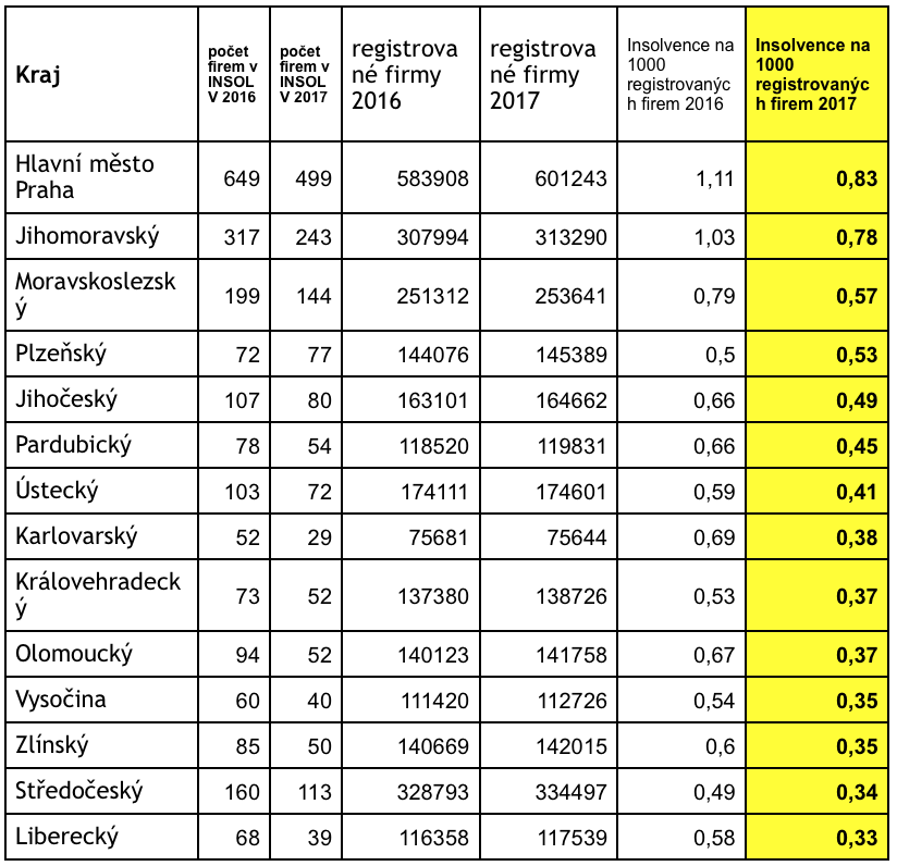 I pořadí krajů s nejvyšším počtem insolvenčních návrhů bylo v roce 2017 stejné jako v roce 2016 a 2015. Pomyslná první příčka patří Praze, následuje Jihomoravský kraj a Moravskoslezský kraj.