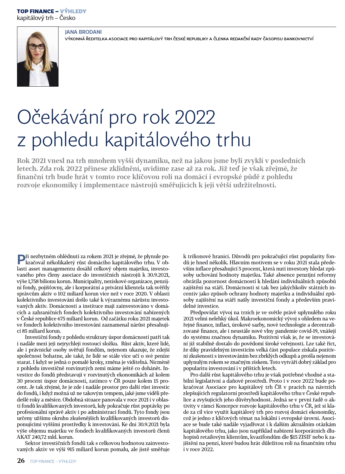 Jak jsme již zmiňovali v minulých dnech, časopis Bankovnictví spustil ke svému stále webu novou internetovou stránku https://www.prilohybankovnictvi.cz , kde naleznete přílohu našeho časopisu Top Finance a v ní úvahy osobností české ekonomiky o roce 2022. Třeba tu od Jany Brodani, výkonné ředitelky Asociace pro kapitálový trh České republiky (AKAT), která se logicky zaměřila na svůj obor a popisuje, co čeká trhy v nadcházejícím roce. Podle ní bude finanční trh hrát zcela zásadní roli doma i v Evropě v rozvoji ekonomik a zavádění nových nástrojů k její větší udržitelnosti. Dodává, že v roce 2021 se opět zvýšil investičním společnosti objem prostředků pod jejich správu. Investování se dle jejího názoru dostává do povědomí široké veřejnosti, a proto se chce AKAT zaměřit na projekty zlepšující regulatorní prostředí kapitálového trhu v ČR a tím i jeho důvěryhodnost.